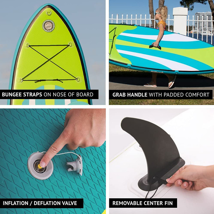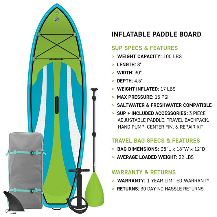 - طقم لوح مجداف كامل: يأتي مع جميع الملحقات الأساسية للوحة المجداف ، بما في ذلك الزعنفة القابلة للإزالة ، ومجموعة الإصلاح ، ومجداف الألومنيوم القابل للتعديل ، ومضخة يدوية ذات لوح مجداف ، وحقيبة حمل على الظهر ويدعم ما يصل إلى 100 رطل.